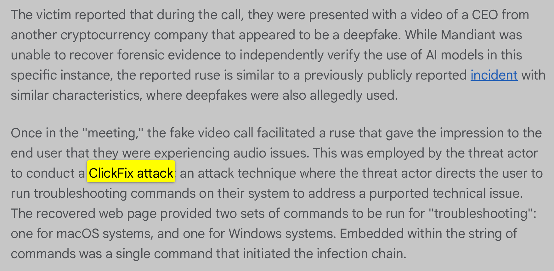 Another recent ClickFix-based attack, also from this month, was uncovered by Google’s Mandiant team. In a report titled “UNC1069 Targets Cryptocurrency Sector with New Tooling and AI-Enabled Social Engineering”, they noted that North Korean nation-state actors engaged with victims and enticed them to join a virtual meeting with a prominent CEO. Once connected, the impersonated “CEO” claimed the victim’s computer was experiencing audio issues and directed them to run troubleshooting commands on their system to resolve the problem. Predictably, those commands resulted in infection of the victim’s device.