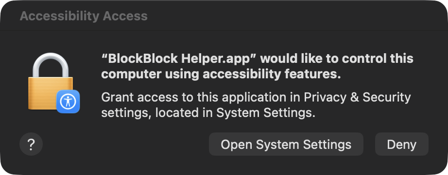 10}];Before going further, let’s note that a global event monitor rightfully requires Accessibility permissions. The following code snippet from BlockBlock shows how to see if the code has such permissions (via AXIsProcessTrusted), and if not, trigger an alert for the user to grant it (via AXIsProcessTrustedWithOptions):