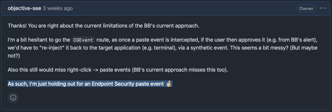 …turns out, as we’ll see, Apple agreed that ClickFix protections should be built atop Endpoint Security—but, as is often the case, only for themselves 😓