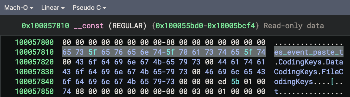 As xprotectd is written in Swift 🤮, it’s a pain to statically reverse. For example, although we see the es_event_paste_t string, there are no cross-references to it: