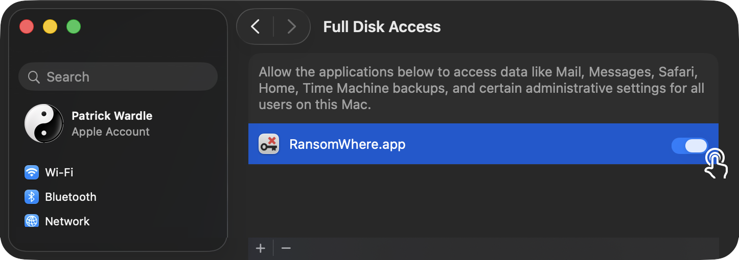 Another requirement of the Endpoint Security framework, enforced by Apple, is Full Disk Access. The first time you install RansomWhere?, it will instruct you on how to manually grant it this permission.