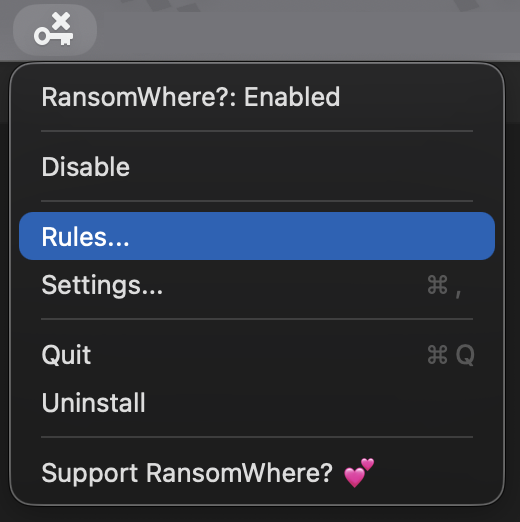 The rapid creation of encrypted files is either allowed or blocked, based on user input ...which are then turned into rules. To open the rules window, click on 'Rules' in RansomWhere?'s status bar menu: