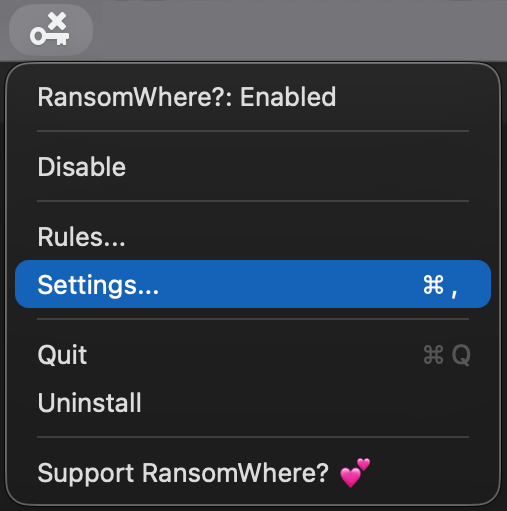 RansomWhere can be configured via its settings pane. To open this pane, click on 'Preferences' in its status bar menu: