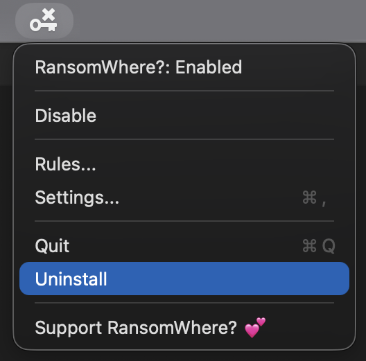 To uninstall RansomWhere, click on 'Uninstall RansomWhere?' in its status bar menu: